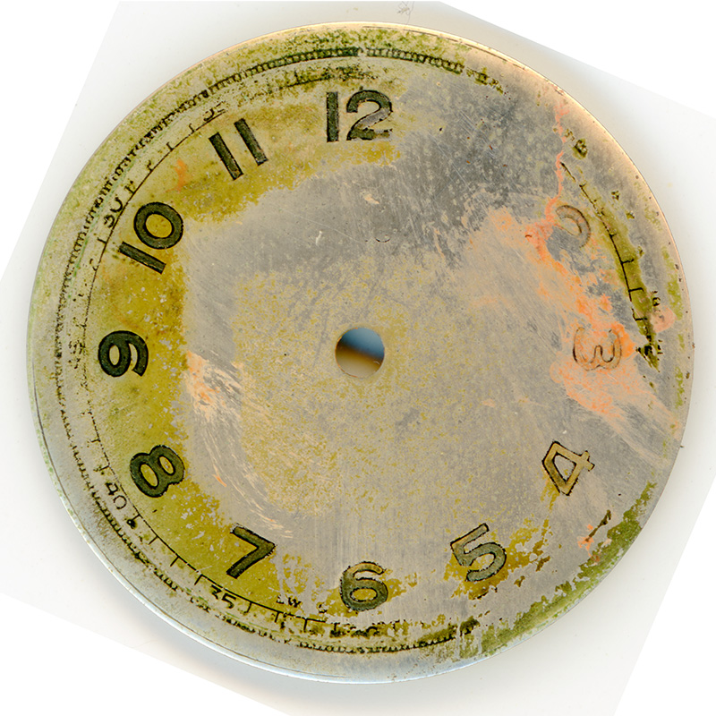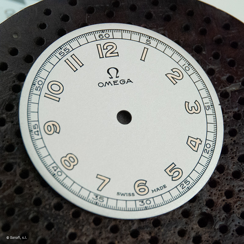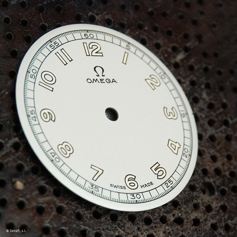 La restauración de esta esfera de reloj Omega —calculamos de la década de los años 40— se ha restaurado a partir de las pocas grafías que quedaban y deduciendo a partir de los trazos existentes, el resto de trazos perdido así como la marca con su símbolo Omega. El fondo de la esfera se ha llevado a cabo mediante una técnica que nuestro taller lleva desarrollando desde hace muchas décadas y que en el mundo de la relojería, tiene más de 200 años de uso. Nuestro taller la denomina fondo «grané de plata» dándole a la superficie de la esfera una pátina especial.